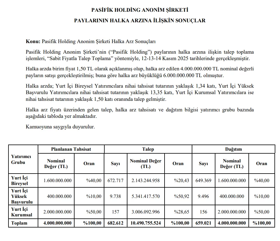 Geçtiğimiz hafta halka arz için yatırımcılardan talep toplayan Pasifik Holding A.Ş. (PAHOL) ile ilgili sonuçlar Kamuyu Aydınlatma Platformu’nda (KAP) paylaşıldı. Peki, Pasifik Holding’in halka arzında yatırımcılara kaç lot dağıtıldı?